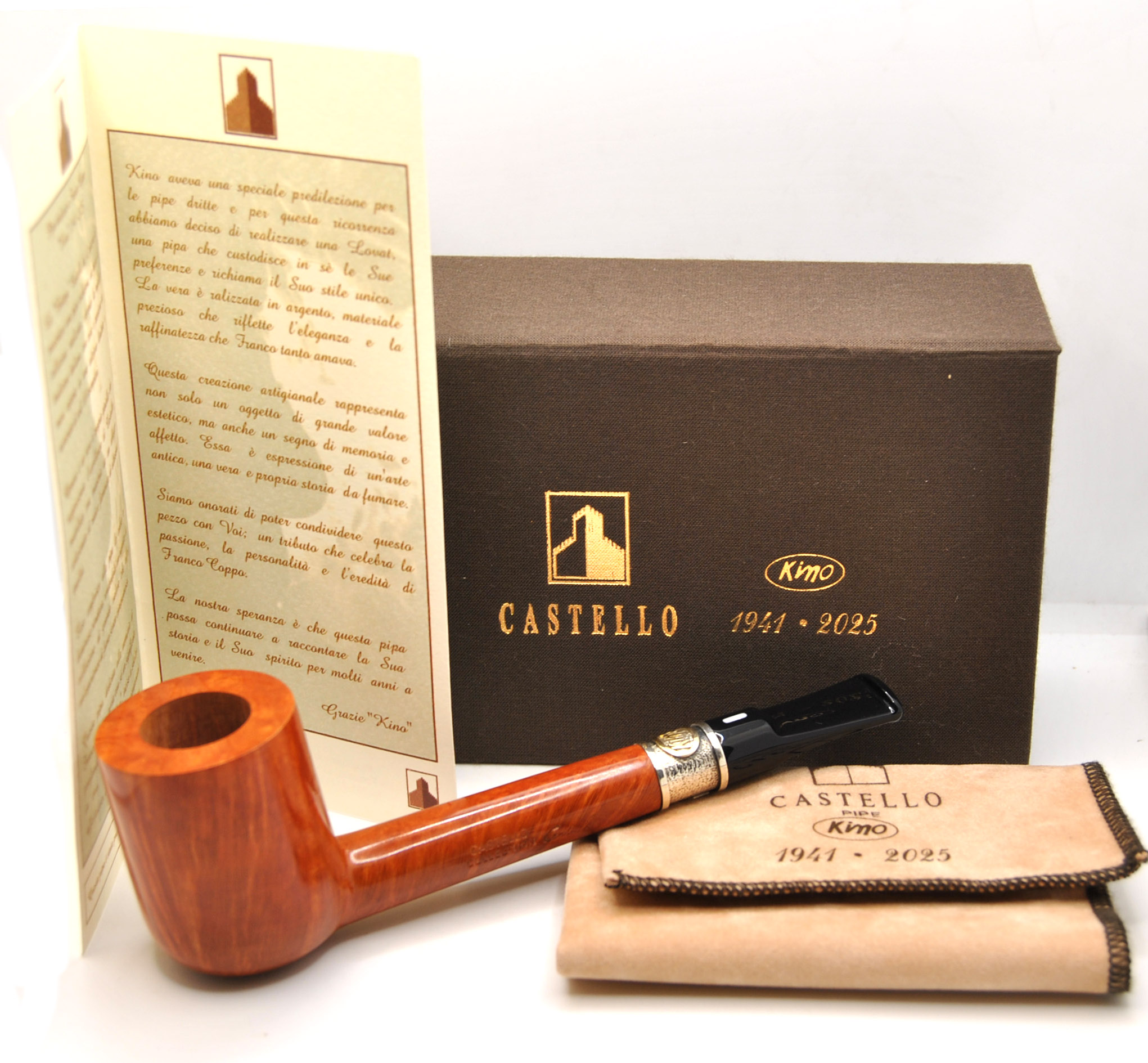Castello Collection Edizione Limitata “Kino” n. 12 di 100 esemplari prodotti, Carlo Scotti, con vera argento lavorata Castello. La pipa è corredata di scatola speciale, sacchetto e pergamena esplicativa dell’edizione – Made in Cantù, Italy